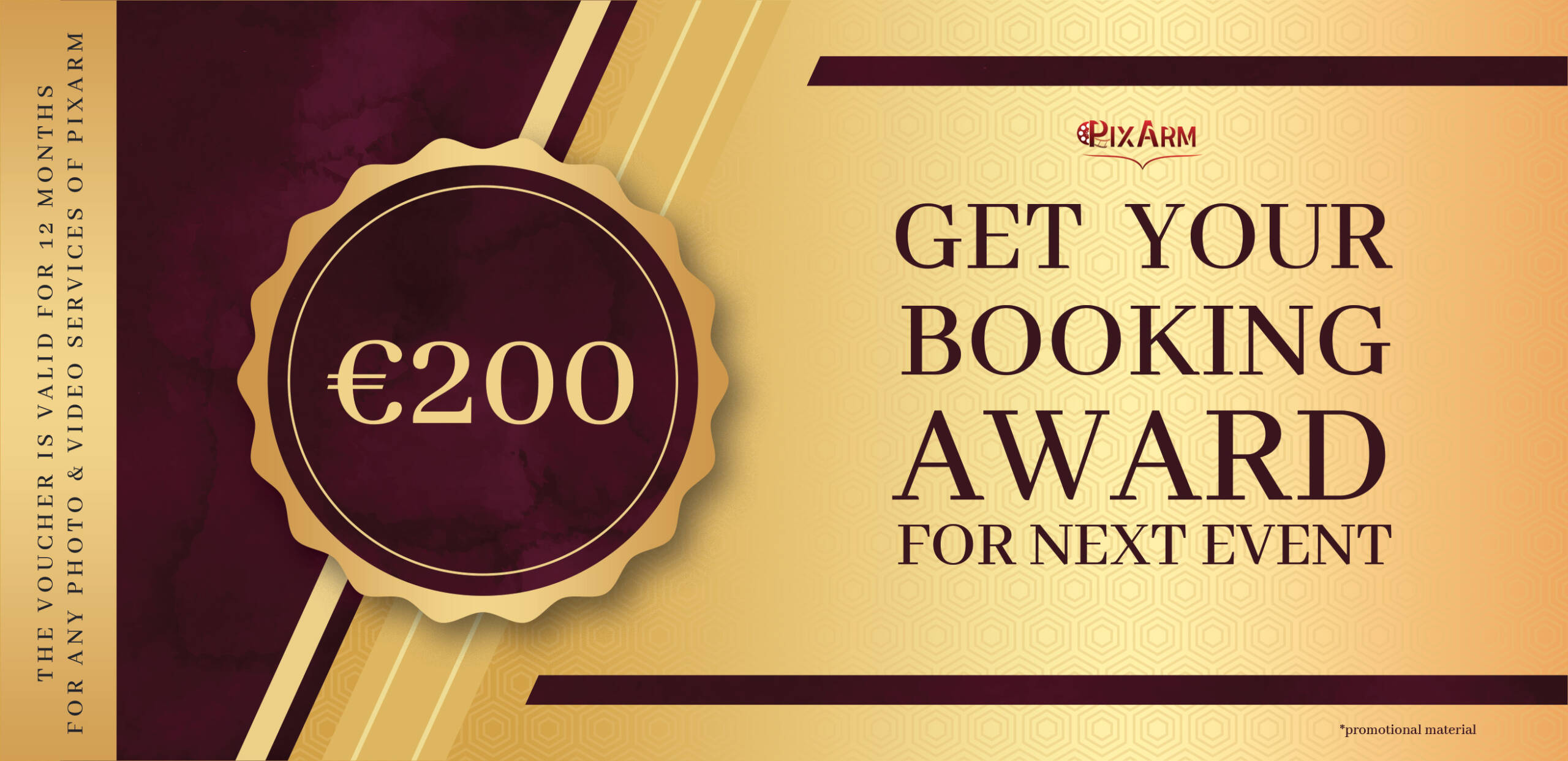 As a client who invested in our top-tier packages, you deserve the best reward. PixArm is pleased to present you with an extraordinary €200 Voucher - the largest discount we offer - for any future booking. This is more than a gift; it’s a strategic saving designed to ensure every major milestone in your life receives the exclusive coverage it deserves.
