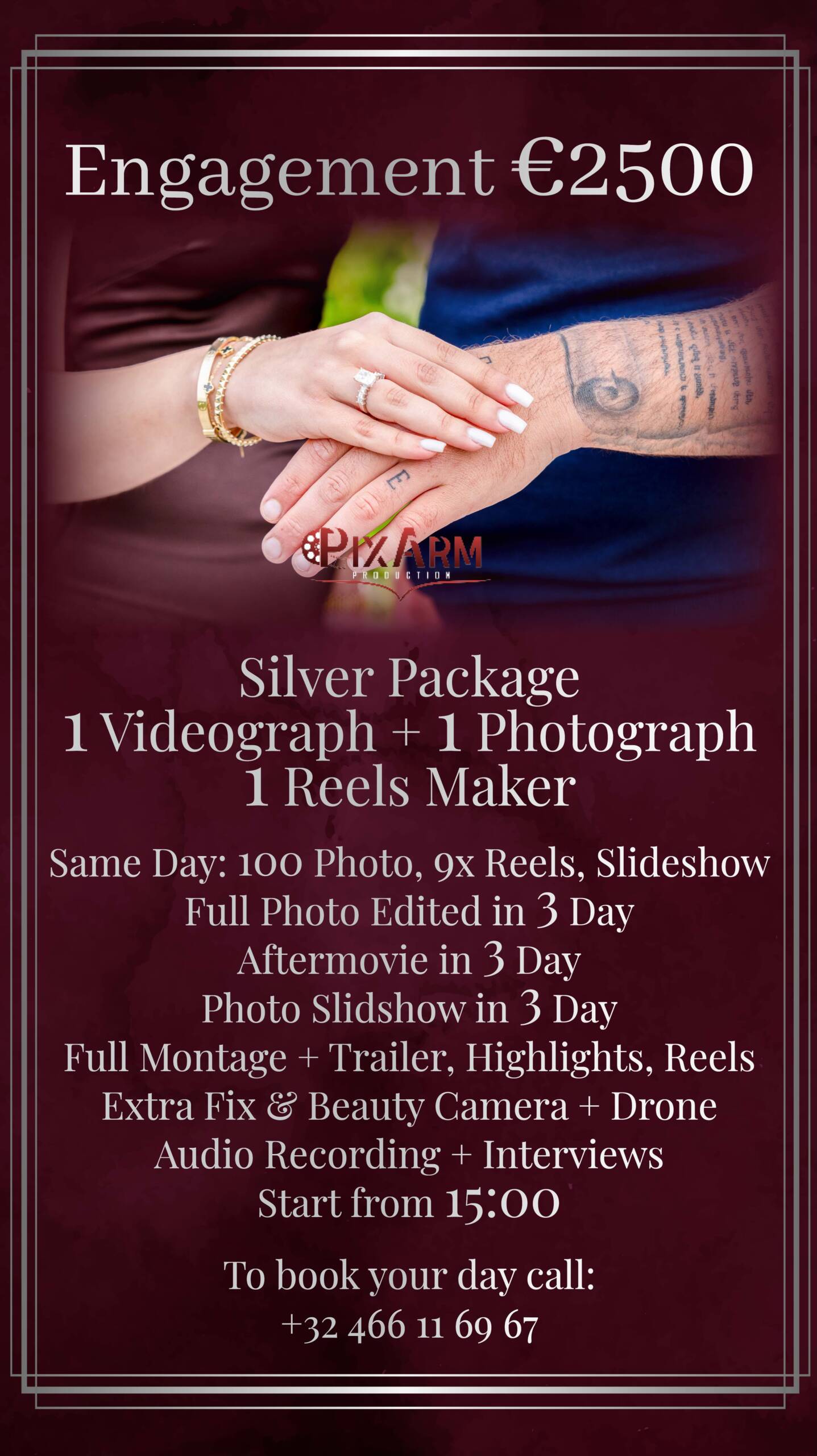 This package includes 1 videographer, 1 photographer, and 1 reels maker to ensure complete, friendly, and unobtrusive coverage of your chosen location and all key interactions in a clean, natural, and cinematic style.
